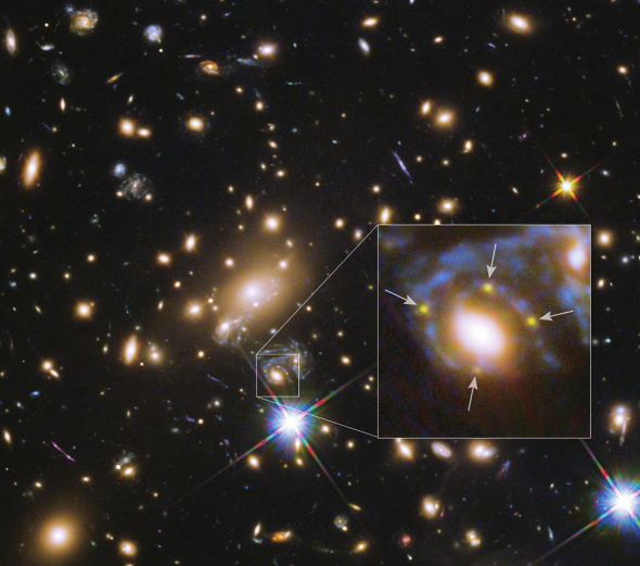 星系团 MACS J1149+2223位于宇宙深处,距离我们足有50亿光年。它充当了引力透镜,能把90亿光年外的雷夫斯达尔超新星(Refsdal)呈现在我们眼前。 当这颗超新星出现时,经过星系团 MACS J1149+2223引力透镜效应的作用,会发生巨大的改变,呈现出4个幻象。 这4个幻象基本上处于对立的位置,就像是一个十字架,是引力透镜效应最著名的例证之一,被称为爱因斯坦十字架。