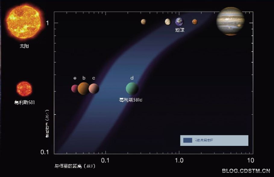 法国科学家新发现的首颗系外宜居行星,名为葛利斯581d,围绕一颗红矮星——葛利斯581运行。红矮星的温度和光亮度均比太阳低很多,故又称为冷恒星。葛利斯581 距离太阳20.4 光年,是太阳的近邻之一。令科学家兴趣盎然的是,葛利斯581 共计拥有六颗行星,构成了类似太阳系的葛利斯581 行星系统。6 颗行星环绕葛利斯581 的运行轨道都近圆形的,偏心率很小。2007 年发现的葛利斯581d 仅是其中的一颗行星,其体积约为地球的2 倍,质量至少是地球的7 倍。最初科学家认为,它距离冷恒星葛利斯581 较远,温度过低,不利于生命存活。2009 年4 月21 日,瑞士天文学家迈克尔·梅耶宣布,葛利斯581d 绕行周期为66.8 天,说明它距离其母星的位置恰处于可维持生命存活的宜居带。