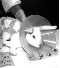 兔子被固定在一种设施上,只有头伸出来,因此它们抓不到自己的眼睛。研究人员将测试物品,诸如漂白剂、洗发精或墨水等,放入每只兔子的一只眼睛中。他们用的方法是把兔子的下眼皮用夹子向外拉,因此形成小槽,受测物品便置于“槽”中,然后把眼睛紧紧合起来。这种手续有时会反复数次。实验人员则每天观察兔子眼睛的发肿、溃烂、感染与流血流脓。这样的研究可以持续3个星期。一位受雇于一家大化学公司的研究人员曾对最严重的反应做过这样的描述:由于角膜或眼内结构的严重内伤,使动物完全失明。动物急迫的紧闭眼睛。动物嘶叫、抓眼、跳,试图逃脱。