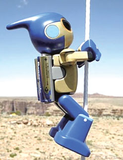 在美国科罗拉多大峡谷举行的一次测试中,一个装有2节“evolta”3号电池的小机器人,历时6小时45分,沿着一根从大峡谷绝壁上垂吊下来、长约530米的绳索上向上攀登,最终成功登顶一举夺魁。