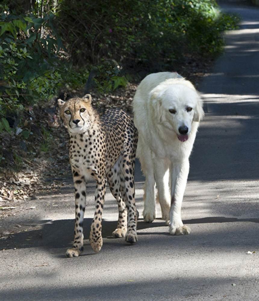 大狗和猎豹:在非洲的牧区,牧羊犬是人们养来对付包括猎豹在内的猛兽的。然而,在美国圣迭戈野生动物园,昔日的冤家成了今日的好朋友,它们常常一起在野生动物园的林间小道上漫步。