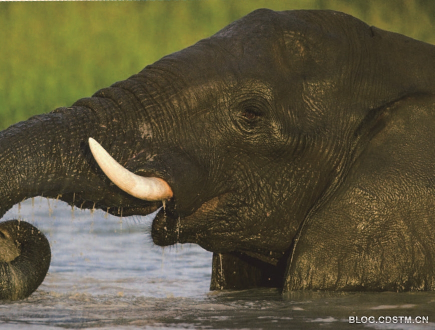 看图中的这头大象的长鼻子紧紧盘成螺旋状,它能从深深的池塘底部捞起烂泥,涂抹在自己的背上,这是天然的遮光剂。