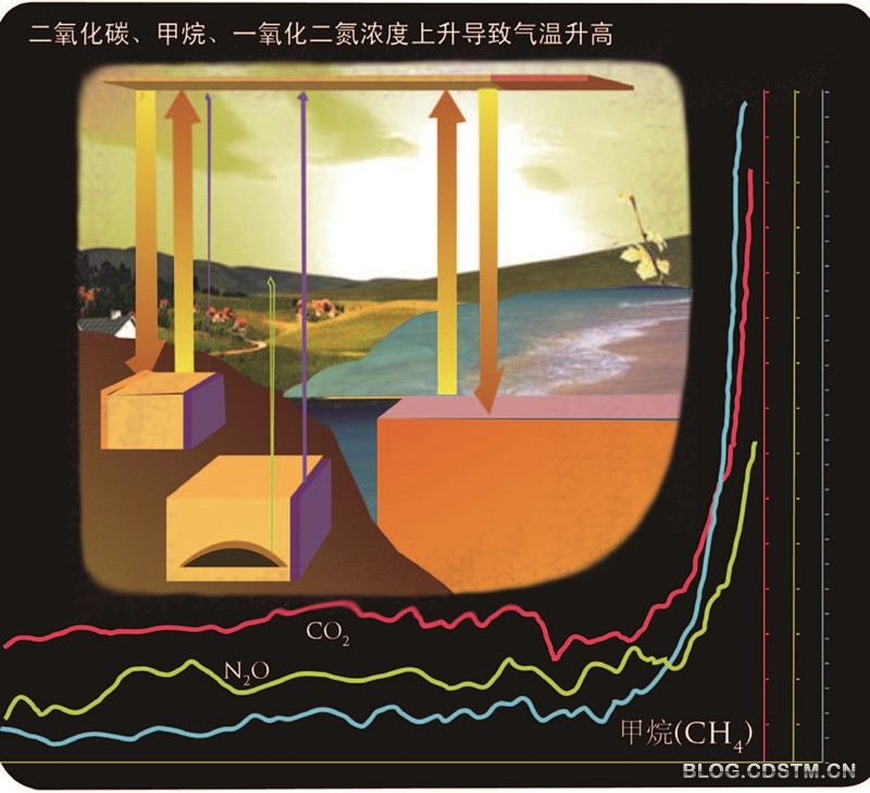 工业革命前,大气中二氧化碳的浓度只有280ppm,到2005 年激增到379ppm。即使在过去的数十万年里,这也是突出的高浓度。除二氧化碳以外,人类还使得甲烷(CH4)、一氧化二氮(N2O)等温室气体的浓度激增。