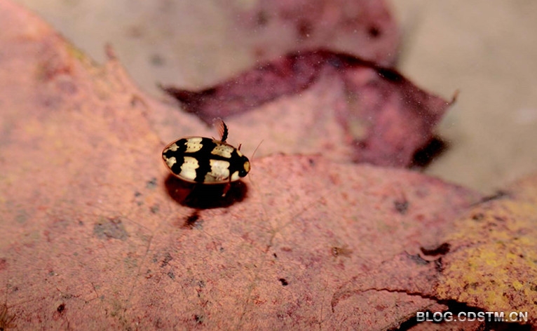 豉甲在平静的水面漂浮着打转转,它们拥有坚硬的有金属光泽的外壳,看起来像一艘艘微型硬壳船