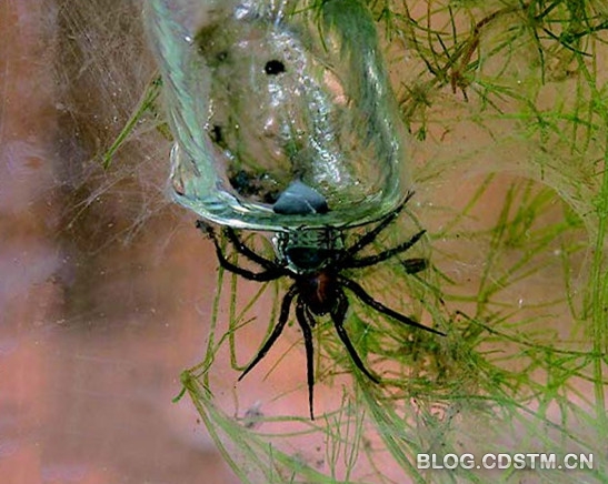 水蜘蛛善于在水生植物之间吐丝结网。由于在网下储存气泡,使原本开展的蛛网成了钟罩形,如同一个小型沉箱,它们便在沉箱里安营扎寨,雌蛛还在其中产卵孵化。水蜘蛛所拥有的气泡群不仅是储氧器,还是一种制氧器——能不断地从周围的水中吸取氧。这就是人们称之为“物理肺”的供氧装置。水蜘蛛在呼吸过程中使气泡中的氧浓度逐渐下降,一旦氧含量低于16% 时,溶于水中的氧便会自行补充进气泡内来。
