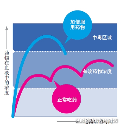 药物的效力是根据其成分在血中的浓度决定的。请看右图:当药物的血浓度在有效范围内,药物才能发挥正确的治疗效果。随着时间的流逝,药物浓度逐渐下降,快降到了无效浓度时就需要再次服药了。所以,保持有效血浓度是服药的时间指针。