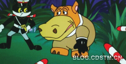 《黑猫警长》里的河马是个窝囊的角色,夜里和大象、犀牛一起偷吃村民们辛苦盖好的红土围墙,而被黑猫警长追得连衣裤都掉了,哭哭啼啼地投降。