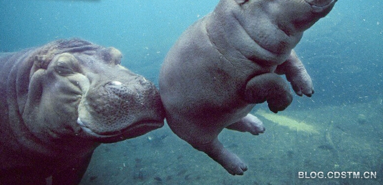 河马妈妈在教河马宝宝新本领,好像在说:“去吧,孩子 ! 有妈妈在,别害怕!”