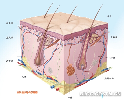 别看皮肤薄薄的,其实它足足有三层。如果我们也会孙悟空的七十二变,变得非常小,进入到皮肤里看一看,那么我们到达的第一个地方,是表皮层。我们会看到一片忙碌的景象,新的细胞不断出生,更换正在衰老死亡的细胞。表皮的最外层,也就是裸露在空气中的部分,叫角质层,角质层全部由死亡的细胞组成。有时候手脚会出现蜕皮现象,脱落下来的就是角质层。