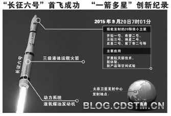2015年9月20日7时01分,“长征六号”运载火箭在太原卫星发射中心点火发射,成功将20颗微小卫星送入太空,创造了中国航天一箭多星发射的新纪录。这么大的“运载量”,让“长征六号”瞬时成为耀眼的“火箭新兵”。