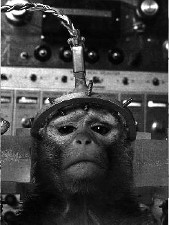 这只猴子的头被钻孔,并且置入一只探针,以注入不同的化学物质,这类的实验通常长达数月