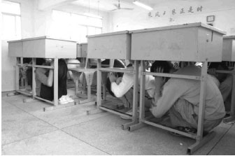 学校避震。地震发生时,首先要有组织地迅速撤离教室到安全的地方。若无条件撤离时,应在教师指挥下迅速抱头、闭眼、躲在各自的课桌下。在没有桌子等可供藏身的场合,无论如何,也要用坐垫、书包等物保护好头部。在操场或室外时,应避开高大建筑物或危险物,可原地不动蹲下,双手保护头部。