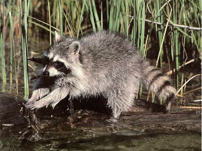 浣熊,脸酷似狸,非常惹人怜爱。浣熊前后肢都长有5个指趾头,能够分开,因此,能捕捉到水中的虾和螃蟹。它经常用前爪捕食和吃食,使用前爪几乎同猴子一样灵活。奇怪的是当捕捉到这些小动物时,浣熊要先洗去这些动物身上的泥土再吃,而且它在吃其他食物之前也总是要把食物放在水中洗一洗再吃,因而得名“浣熊”。