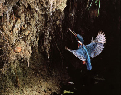 在经历第一个严重的冰冻期后,很多小溪和池塘都在短时间里结了冰,而有泉眼的小池塘,仍会有几米见方的水域不被冻结。这时,聪明的翠鸟就把家安在这片不冻水域的旁边。几乎每一天。翠鸟都会多次俯冲入冰冷的水中,有时多达上百次。即使在严重冰冻的天气条件下,它每天也能捕获50多条小鱼,比小说上描述的要多得多。寒冷的天气常常消耗它很多体能,每次捕完鱼,翠鸟总要及时抖落夹带在羽毛中的水珠,在寒冷的冬天,学会这一生存技能至关重要。睡觉时,翠鸟躲进灌木丛,把脑袋藏入背部的羽毛中。有时为了取暖,它甚至胆大包天地睡进人的居室。