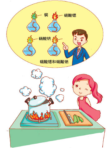 “是这样的!”老师听到我们的提问很高兴,“我们知道铜燃烧时,火焰会变成绿色;而硝酸锶、碳酸锶燃烧时,能使火焰变成红色;硝酸钠、草酸钠燃烧时火焰是黄色;将硝酸锶和硝酸钠按一定比例混合,燃烧时火焰是桔红色。只要把这些药品按不同的比例和次序放在烟花里,烟花在燃烧时,火焰便呈现不同的颜色,五彩缤纷的焰火就展现在我们的眼前了。”
