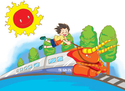 看了一眼图,歪歪乐了。这不就是火车嘛!而且是最近两年流行的动车组的样子。不过说来,火车确实长得有点像蜈蚣,长长的身子,很多很多的轮子。
