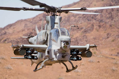 最早的武装直升机并不是“专业选手”,只能算是半路出家,这就是美国在越南战争时期广泛使用的UH-1军用直升机。UH-1本来只是一种军用运输直升机,在越南战场上负责运送美军的空中骑兵营进入和撤离作战地域。执行这样的任务时,直升机上的成员常常需要用火力给自己开辟出相对安全的着陆场,也需要对地面武器的打击进行还击。为此美国人给UH-1装上了机枪和火箭发射器,战场实践证明这是一种很不错的改装,武装后的UH-1常常可以从低空对地面的掩体工事以及人员进行居高临下的打击,给敌方造成了重大损失。美军在使用UH-1的过程中,也发现了这种武装直升机的一些弱点,它没有装甲保护,子弹打上就是一个洞,如果正好打在油箱上或发动机上,直升机会立即坠毁;而且UH-1既要运载士兵和物资,又要参战,它的飞行速度较慢,容易被敌方打中。此外,UH-1的机枪和火箭都不算是专用武器,打击能力有限。因此,美国很快着手研制新型武装直升机,这就是后来名噪一时的AH-1“眼镜蛇”武装直升机。