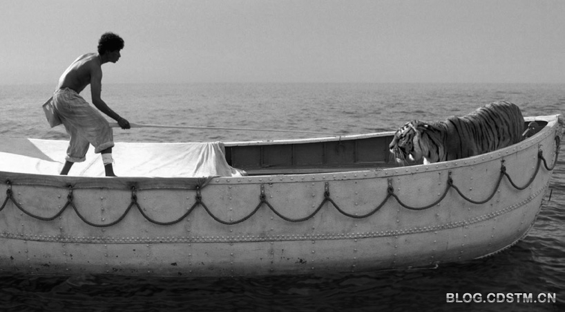 五种风马牛不相及的动物(假如人也算一种),被局限在汪洋大海中的一条小船上,接下来的一幕是残酷的,讨厌的鬣狗咬死了无辜的斑马和猩猩,而更加凶猛的理查德•帕克吃掉了鬣狗。于是,剩下了惊恐万分的少年派孤独地与孟加拉虎对峙。其实这一段剧情,少年派策划了好几个摆脱理查德•帕克的方案: