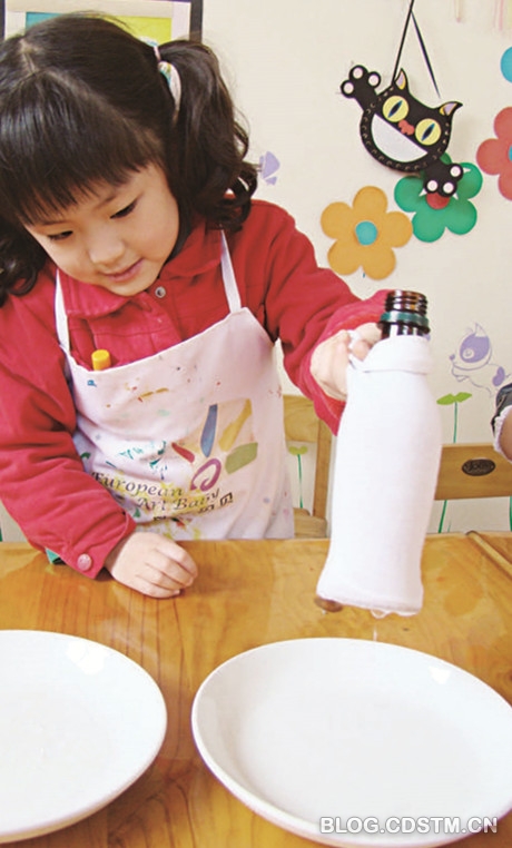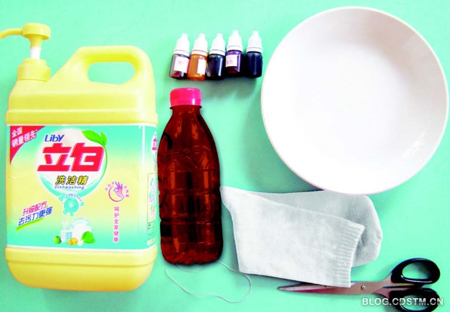 洗涤剂、瓶子1 个、 新袜子1 只(或者洗干净的旧袜子也可以)、剪刀1 把、盘子2 个、各色色素若干瓶