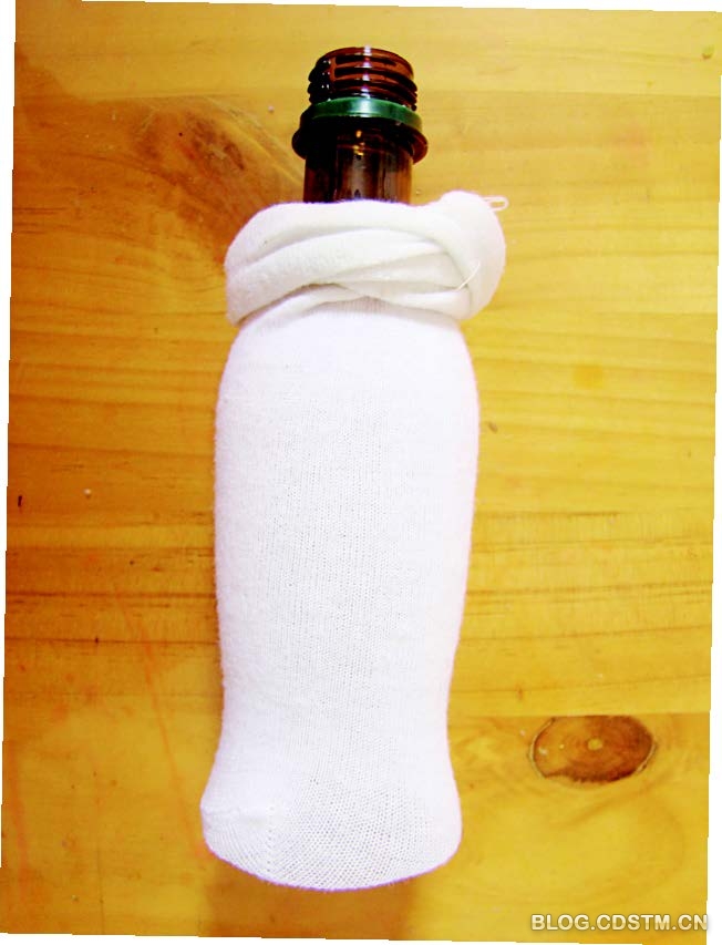 1. 将瓶子底部剪掉,套上袜子并系紧。