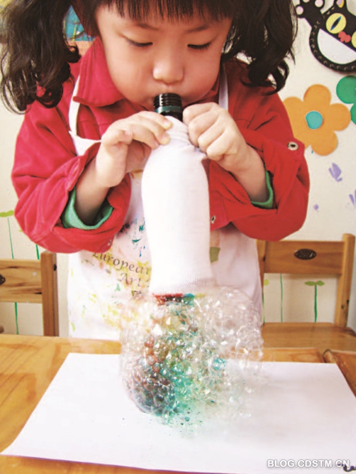 5. 向瓶口里吹气,这样,在瓶底就会冒出很多小泡泡啦。注意,不要试着吸气回来,以免把肥皂泡或肥皂水吸到嘴巴里。