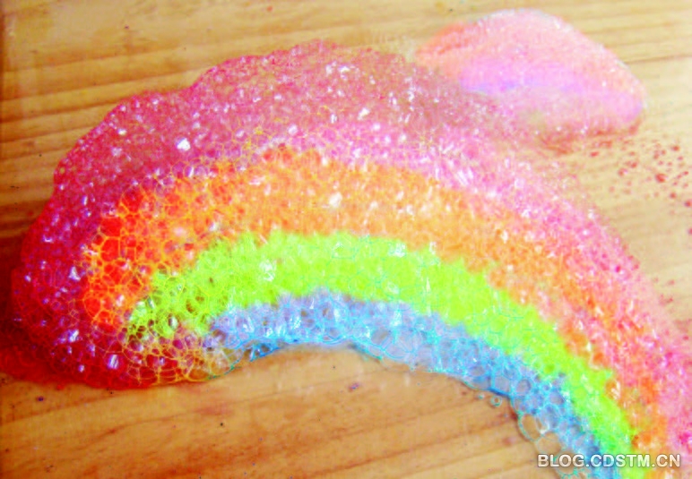 6. 如果慢慢地移动瓶子底部,并不停地吹,一条彩色的泡泡龙就会出现了。
