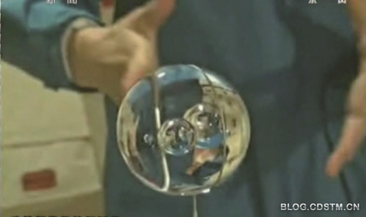 神舟十号上的女航天员王亚平正在太空舱中往水球中吹气泡。在太空中,水膜随着加水量的增加,慢慢变成水球,而在水球中吹入的气泡,也会停留在生成的地方。