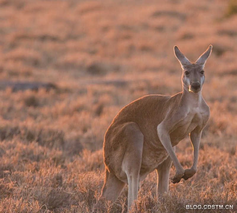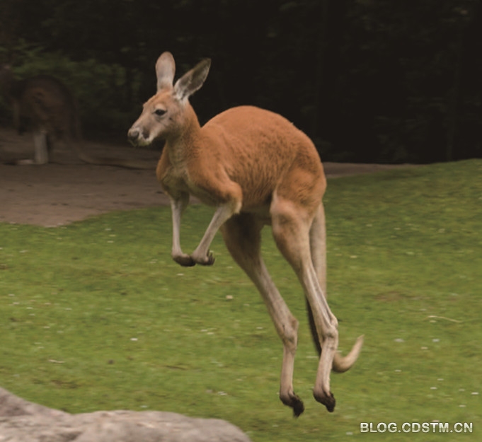 袋鼠的两条后腿总是同起同落,它们把自己的重心放在前爪和尾巴之间,用它们强而有力的后腿向前跳跃。