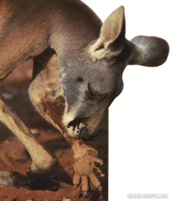在炎热的生存环境下,红袋鼠有一个很奇怪的动作,就是用唾液把前肢弄湿。再来看看它们的前爪有怎样的功能:大赤袋鼠善于用前爪在泥土里挖出一个浅浅的坑,便于躺在里面休息;在互相打斗时,前爪还可以保护自己、防御敌人。