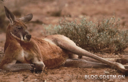 红袋鼠舔舐自己的前肢,直到那里的皮毛和皮肤湿透了为止。对于这个动作,你不必感到奇怪。当风从湿润的地区吹过来,唾液就被蒸发了,从而带走身体的热量,帮助大赤袋鼠凉快下来。