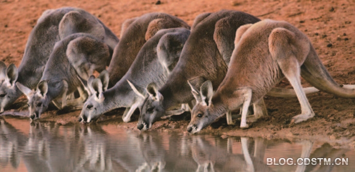 当太阳下山时,红袋鼠就开始活动了,趁着外面凉快的时候去觅食。当它们想喝水了,会成群结队地去寻找水洼。