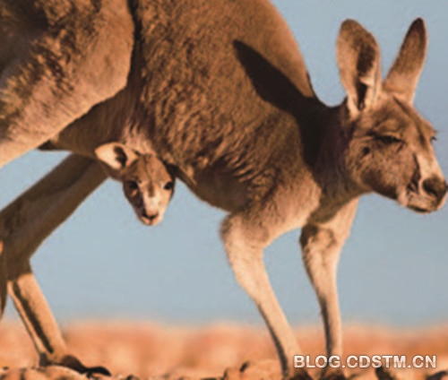 和所有的袋鼠一样,红袋鼠是一种有袋类动物,这就是说,它们把小袋鼠放在育儿袋里养育。现在红袋鼠是濒危野生动物之一,孕期为343 天,经过艰苦的“十月怀胎”,一般产下1 仔。当袋鼠妈妈快生小宝宝时,便用舌头把育儿袋里的脏东西舔干净,迎接新生命的到来。