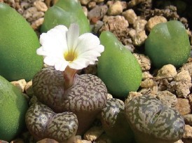 在非洲南部的荒岛上,生长着一种叫做生石花的植物。这类植物的叶子长得像一块块半埋在沙漠中的石头,有的呈灰绿色,有的呈灰棕色,有的镶嵌着深色的花纹,有的则布满深色的斑点。开花季节,鲜艳夺目的花朵从石缝中盛开,花冠黄色、白色、玫瑰红色。花季过后,荒漠上又恢复了“石头”的世界。借着这一奇特的伪装,生石花才免被食草动物取食,保存下宝贵的物种基因。