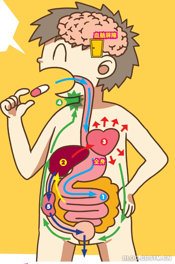 首先,药和食物一样,由胃到肠,被肠吸收(1)。被吸收的药的成分进入肝脏(2)。肝脏是分解外来异物使其无害化的器官,药品也是种异物,所以也是肝脏里代谢酶的分解对象。药品的有效成分不能被分解,在设计药品时就要考虑好。通过肝脏的药随血流遍全身(3)。例如,治疗喉痛的药也得随血流遍全身,其中一部分好不容易到达目的地,终于起效(4)。已经起过效用的药怎么办呢?治疗后,如果药物一直留在体内是有害的。经过一段时间,肝脏里代谢酶逐步将药分解,使其失效,最后通过肾脏随尿排出(5)。