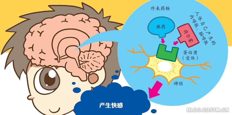 “脑内麻醉药”内啡肽、脑啡肽和受体结合时产生快感,吗啡、海洛因等毒品也能和受体结合使人产生幻觉。