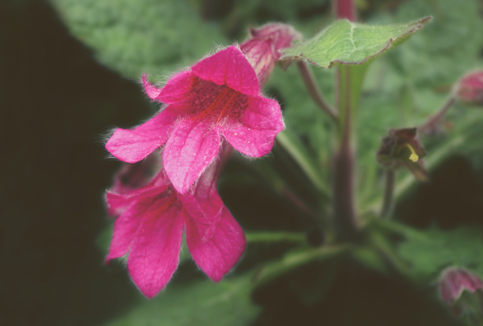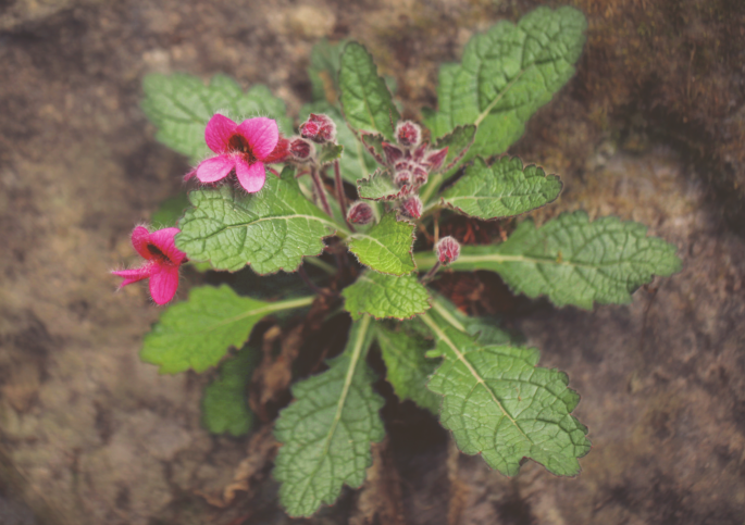天目地黄又叫浙地黄、紫花地黄、天芥菜、秦氏地黄、蜜糖罐、蜜糖花,属于玄参科地黄属,多年生半常绿草本。它原产浙江、安徽等地(但凡“天目”打头的物种,都是天目山特有或最初发现于天目山的种类,天目地黄应属后者),一般长在海拔 190~500米的地区——山坡草丛、路边溪畔、田野村头、墙脚砖缝,无处不见它秀丽可人的倩影。天目地黄喜欢阴湿凉爽的环境,不是特别怕冷,但很怕热。它个头不大,整株一般一尺左右高,全身都毛茸茸的,像小动物一样萌;叶子鲜嫩繁茂,团团围坐;每年四五月间,数枝花梗抽出叶丛,朵朵花儿是艳丽的玫红色,自下而上、次第开放,或秀于叶丛,或生于叶间,盛开的像风铃摇曳,半开的呢?像朱唇轻启,娇而不媚,艳而不俗。