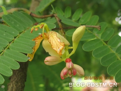 此外,酸角树还是一种优良的庭院植物。酸角树的树干粗壮,其树冠如伞,常年绿树成荫,树型优美。在美丽的西双版纳,每年二三月,酸角树就开花了,可持续到六七月。盛开的花,浅黄清雅,唯有花瓣镶有缕缕紫红条纹,花瓣边缘如波浪翻卷,似一只欲振翅飞翔的小鸟,生动可爱。
