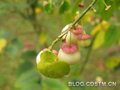 作为大戟科植物的一员,甜菜在形态上也有其独特之处。上半年,小灌木绿意葱翠,纤细的枝条上,一枚枚叶片下,藏着朵朵整齐排列的淡红色小花。等到了下半年,你可以看到甜菜的叶子开始发黄,枝条下挂着一串圆溜溜的硕果,如小汤圆一般,乳白色,果梗有宿存的红色萼片,如同戴着一顶精致小巧的维族帽子。