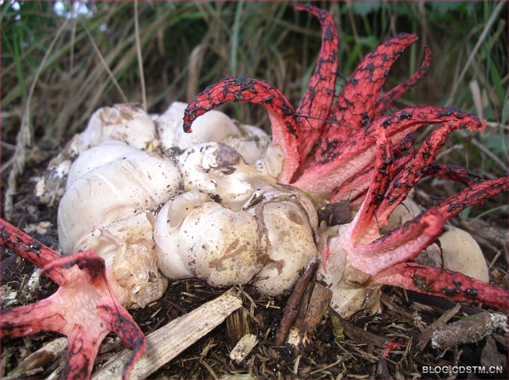 阿切氏笼头菌 (Clathrus archeri),俗称恶魔指菇或者章鱼鬼笔菌,是一种比较罕见的真菌,它们小时候从黏糊糊的带壳包膜里“孵化”而出,展开鲜红而诡异的枝节,散发出恶臭难闻的气味……让你在野外遇见了,绝对会以为是发现了异形生物的腐烂尸体。其实,这种腐臭是为了吸引昆虫帮助它们传播孢子。
