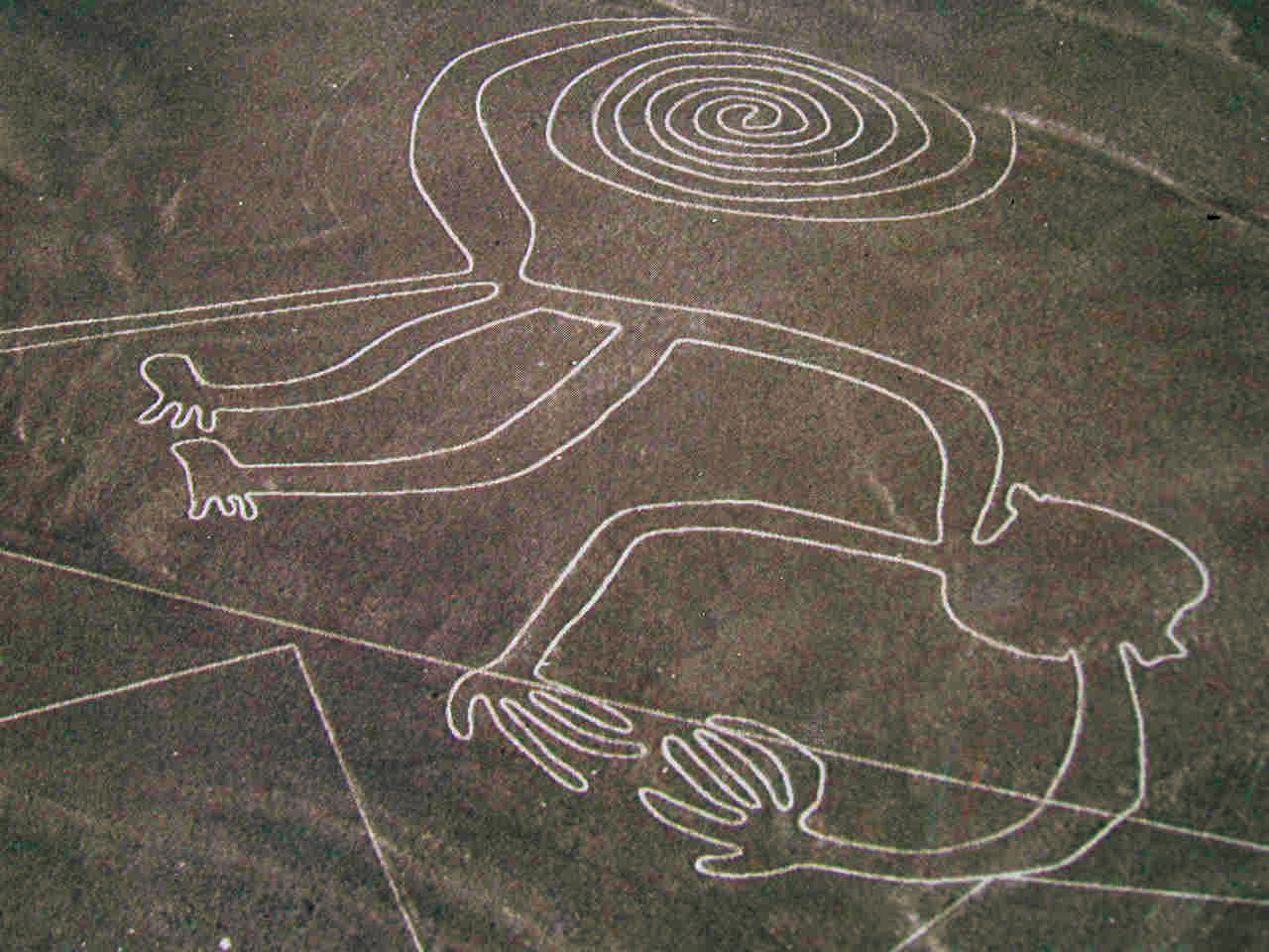 如果你有机会乘坐飞机飞临位于秘鲁南部安第斯山脉的高原古城纳斯卡一带,一定会被眼前出现的一幕壮丽场景所震撼:在纳斯卡山谷的荒漠中布满了长度几百米到几千米不等、宽窄不一的巨大线条。它们以直线和箭头形线条为主,也有三角形、长方形、菱形、梯形、螺旋形等几何图形,以及栩栩如生的蜥蜴、蜘蛛、卷尾猴、老鹰、海鸥、蜂鸟、仙人掌等动植物的形象。