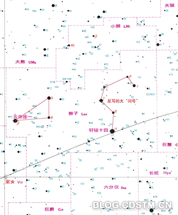 现在,先让我们来认识这头巨大的狮子吧。请你在3月初晚上11点前后,或3月中旬晚上10点前后,或者3月底晚上9点前后,面向南方,抬起头来就可以看见6颗亮星构成了弯弯的镰刀形,刀口朝西,像一个反写的问号。问号下端的那一点,是一颗1等星,它就是狮子座α,中国古称“轩辕十四”。传说“轩辕”是中华民族的共同祖先,也就是“黄帝”。把星星命名为轩辕,是表示对他的敬意。“轩辕”这一群星共有17颗,但其中好些星都比较暗。亮的只有组成“问号”的这6颗,其中又数第十四号星最亮。轩辕十四的视星等为1.35等,在全天空的21颗1等星中,它的亮度居于末位。但鉴于它在天空中位居要津,赏星人仍应牢牢地记住它。
