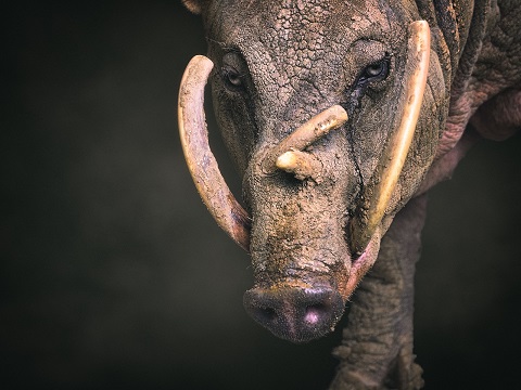 雄性鹿豚的4颗犬齿全部向上弯曲生长,其中2颗上犬齿会在生长过程中穿过上唇和鼻腔,刺穿皮肤向后形成钩状,就像鹿角一般,它们名字中的“鹿”字正是由此得来。有时,这犬齿长得不巧,甚至会弯到自己的眼窝,影响视力。獠牙长成这样,连看东西都碍事,更别提当作攻击对手的武器了。幸好,它们生活的地方也没有什么强力捕食者,倒也不需要拥有堪当武器的獠牙。