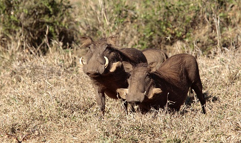 疣猪常常会跪在地上吃草,一有风吹草动,立即就会翘起自己的小尾巴屁颠屁颠地一路小跑逃走。