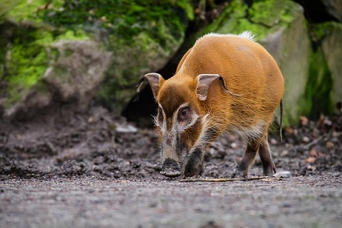 红河猪分布于西非和中非潮湿的森林地带,体重只有45-115千克,体长只有1-1.4米,比同样生活在非洲的大林猪小不少。它们的体毛为醒目的橙红色,腿是黑色的,沿背部中线分布着白色簇状毛发,看起来十分亮眼。红河猪的面部黑白相间,再加上耳簇的长毛,颇有几分小丑的扮相,十分滑稽。