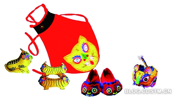 孩童的衣着玩具。除了布老虎,还有虎头鞋、虎头帽、虎肚兜等,这些都是给出生不久或是已经满月的孩童的特殊装扮和玩具。除了给孩子的童年带去乐趣,更多的还是赋予了长辈对孩童的无限期望,寓意着孩子可以像虎一样强悍、灵活。