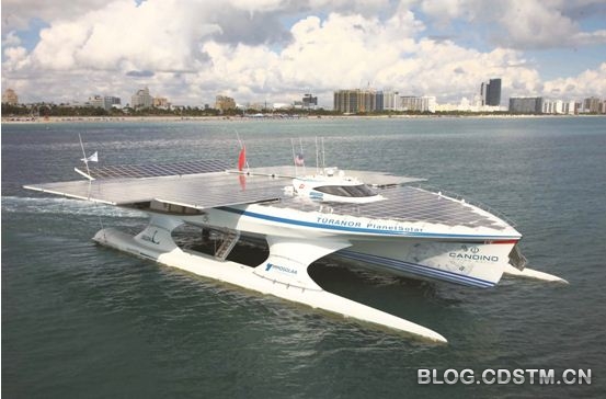 2012年5月4日,世界首艘太阳能动力双体船“星球太阳号”完成环球之旅。这艘船于2010年9月27日自摩纳哥起航,整个航程约8万km,耗时长达20个月。该船是目前世界上最大的全太阳能动力双体船,它的甲板上铺设了537 m2的太阳能电池板,为船体两侧配备的4个电动马达提供能量。船上同时配有6个巨型充电锂电池,从而保证该船可以在没有日照的情况下继续航行。船体长31 m,可容纳40名乘客。