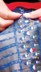 把花带中间的挑花部分穿上综丝,花纹图案是靠手工操作综丝来控制的。