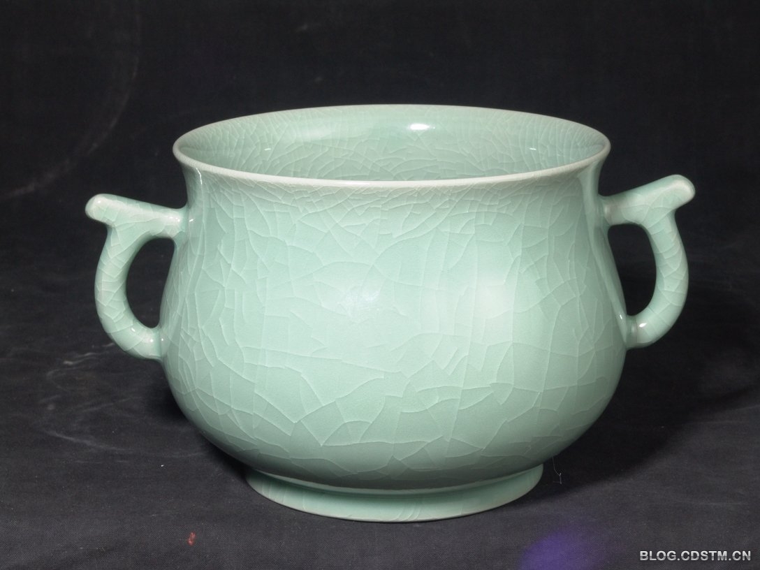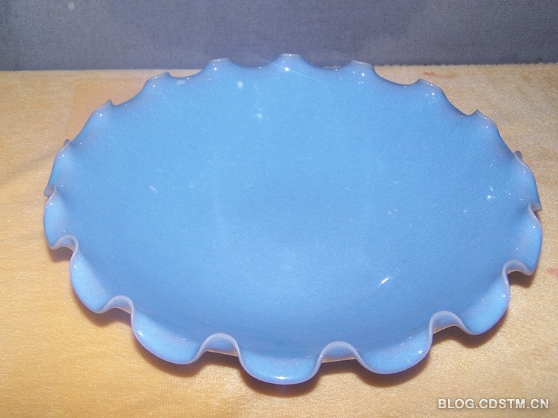 关键是半乳浊状的结晶釉,这种结晶釉对色与光极其敏感,青绿釉却能从内反射出红晕。釉子稍厚处,如凝脂般将青翠固化,又如蜡滴微淌,将玛瑙融化之后又将其垂固。釉子稍薄处,如少女羞涩面现昏红,又如晨曦微露,将薄云微微染红。釉面滋润柔和,纯净如玉,有明显的酥油感觉。抚之如绢,温润古朴,光亮莹润,釉如堆脂,素静典雅,以色泽滋润、纯正,纹片晶莹多变为主要特征。视之如碧峰翠色,有似玉非玉之美。汝瓷釉面的光泽,不如官、哥瓷晶莹,更逊于龙泉青瓷,与同为贡御性质并亦为出土的定瓷、龙泉瓷标本作比较,汝釉的光泽度,大抵只及后者的1/3略强。这说明,玛瑙入釉,致使汝釉的玻化程度和釉质的抗腐蚀性均有所下降。