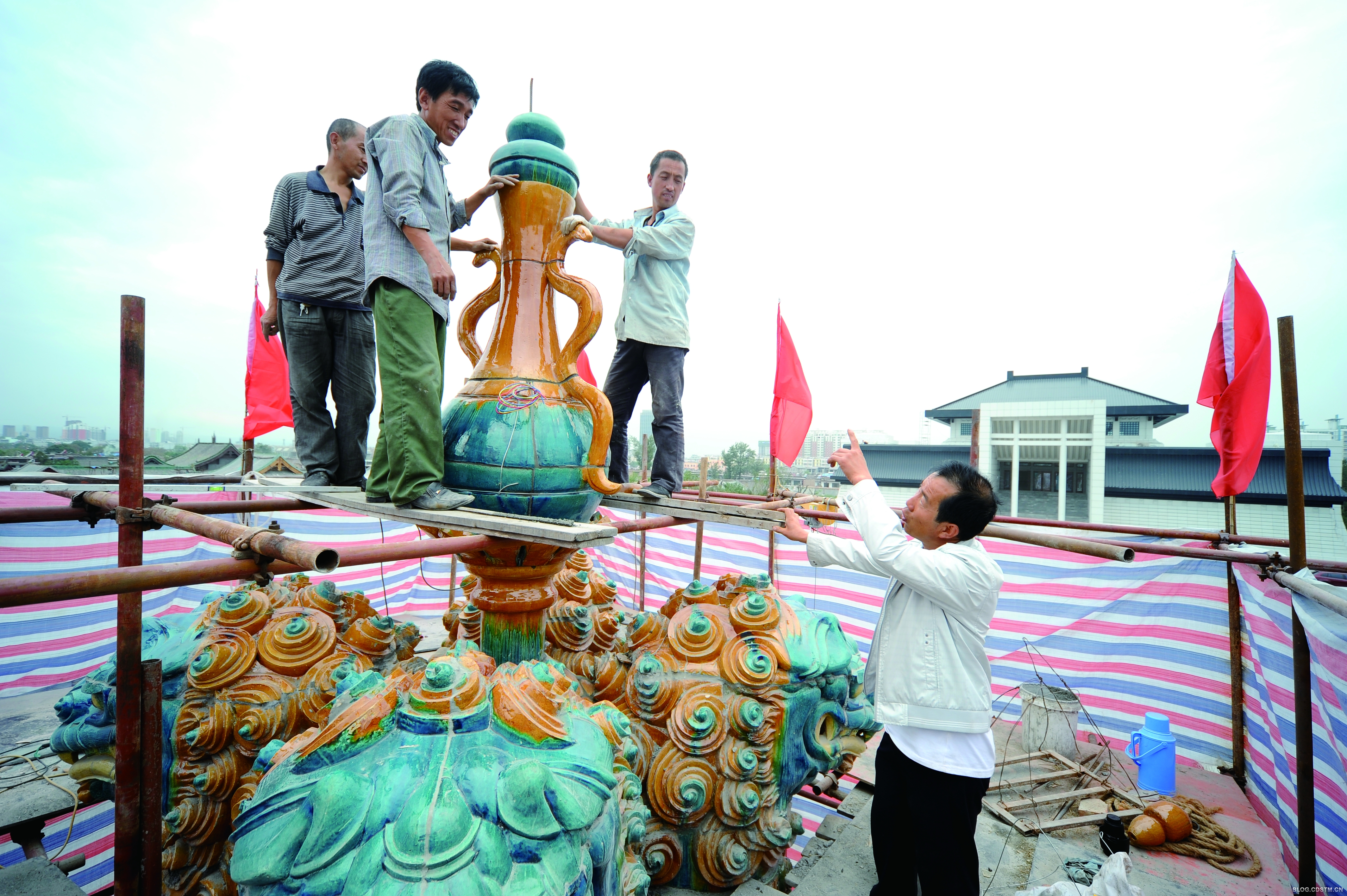 在介休三贤广场,有一座独具介休特色的琉璃雕塑让人称奇,那是一座方形的四狮抬瓶琉璃雕塑。当地人取意为 “时时太平,世世太平”,寓一方平安。整个雕塑,汇聚了介休市特有的孔雀蓝、朱丹红、金黄等各色琉璃精品,其中孔雀蓝古法的破解让四狮抬瓶更堪一绝。