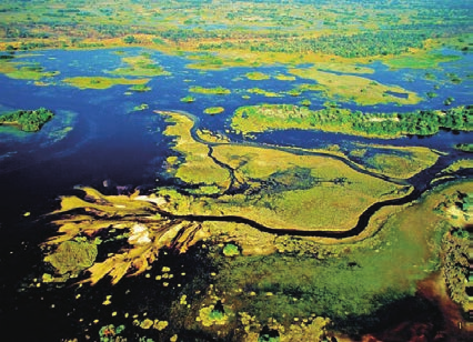 三角洲是河流入海时所携泥沙沉积形成的一片向海伸出的平地及其发展成的冲积平原,从空中俯瞰地面,在江河入海口,沙洲、滩涂、小岛等陆地和水流组成一个大体呈三角形的平原体系,三角形的顶角指向河流上游,底边是其面向海洋的外缘。